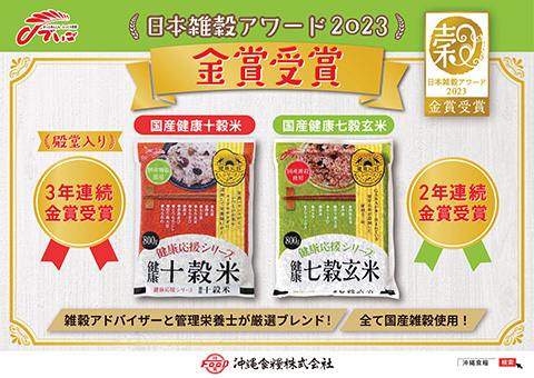 ![]() (一社)日本雑穀協会が主催する「日本雑穀アワード2023」において【国産健康七穀玄米】が2年連続『金賞』受賞、【国産健康十穀米】が3年連続『金賞』受賞となり、同アワードで『殿堂入り』を果たす |