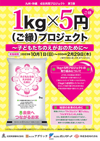 ![]() 九州・沖縄の米卸4社共同で統一商品を販売し、収益の一部(1kgにつき5円)を各県の子どものために活動を行う行政や団体等へ寄付する取り組み「1kg×5円(ご縁)プロジェクト~子どもたちのえがおのために~」を実施 |