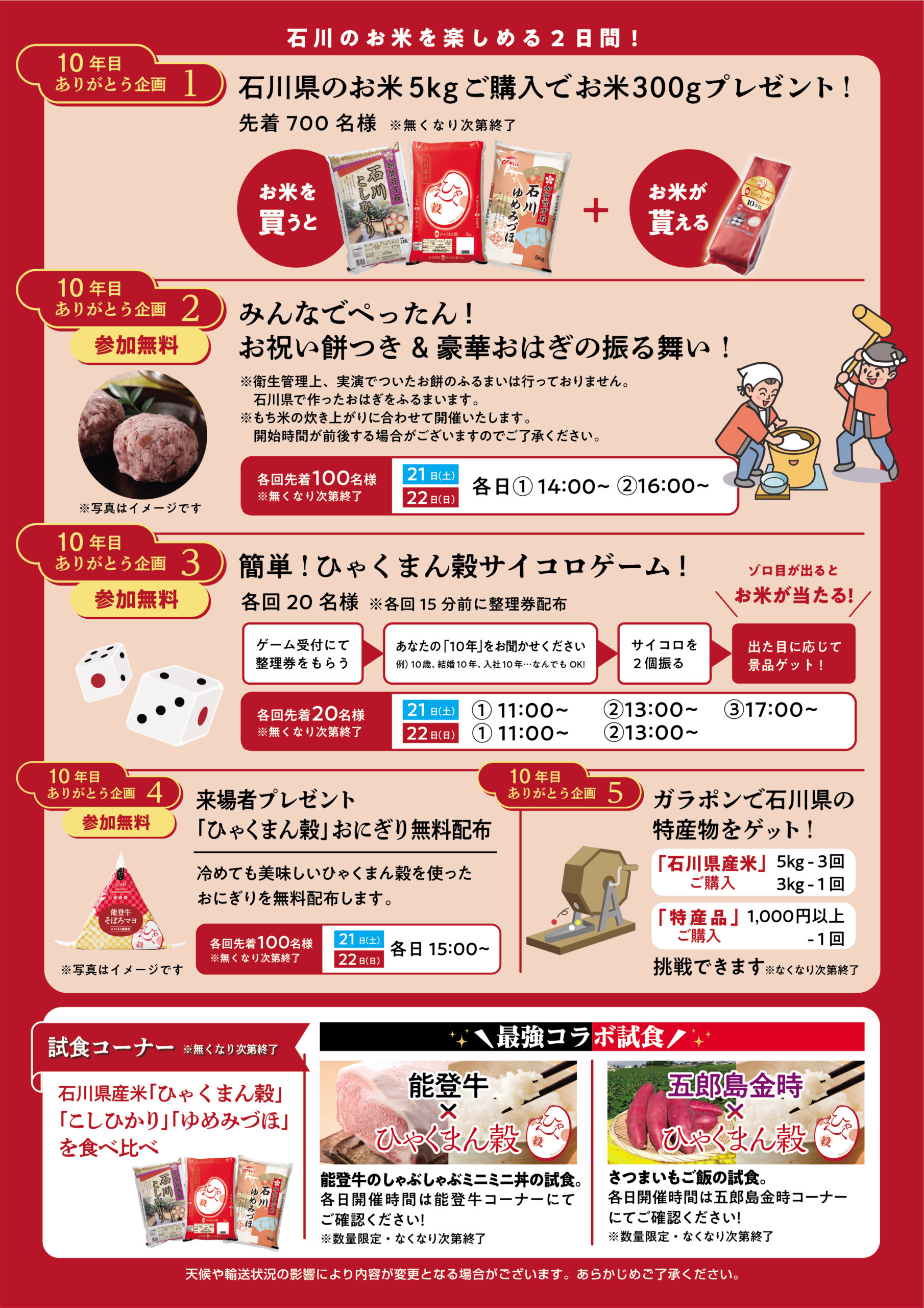 石川県産「ひゃくまん穀」、「こしひかり」、「ゆめみづほ」の食べ比べや、能登牛×ひゃくまん穀、五郎島金時×ひゃくまん穀の試食、石川県能登のご飯のお供×ひゃくまん穀の試食や、ひゃくまん穀おにぎり各日100個の無料配布、みんなでぺったん!ぺったん!餅つき実演パフォーマンス&おはぎふるまいやサイコロゲームなど楽しいイベント盛りだくさんです!